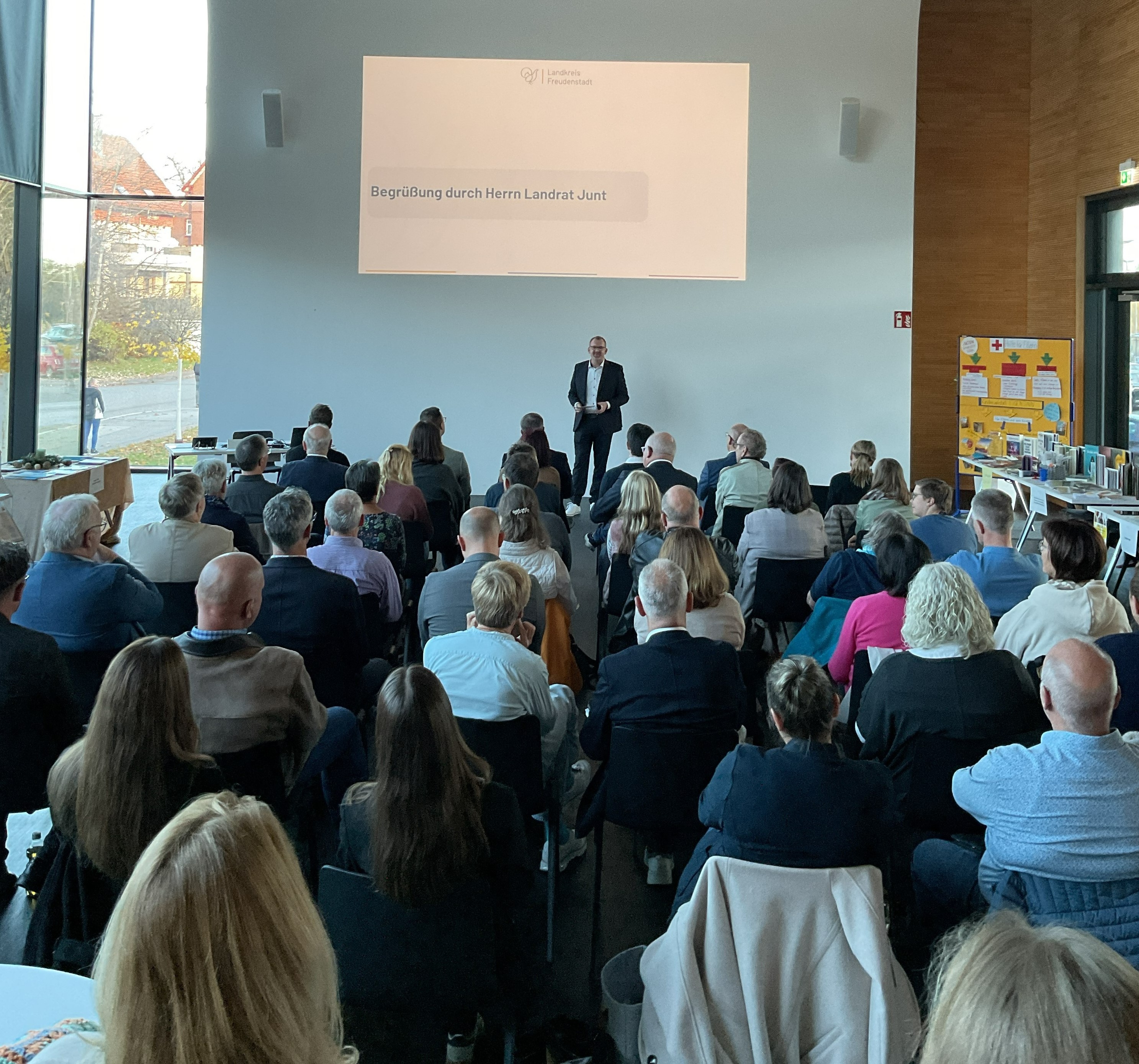 „Vielfalt entdecken, Gesundheit erleben und Zukunft gestalten“ unter diesem Motto lud die Geschäftsstelle der Kommunalen Gesundheitskonferenz unter der Leitung von Anja Ruf zu einem interaktiven und erkenntnisreichen Abend ein. Nach der Begrüßung durch Landrat Andreas Junt, stimmte Betty Busam vom Gesundheitsamt mittels der Methode des Storytellings auf die Thematik des Abends ein. Die fiktive Geschichte von Leonie aus dem Landkreis Freudenstadt veranschaulichte, wie viele Akteurinnen und Akteure in verschiedenen Projekten Gesundheit im Landkreis gestalten – und das von der Geburt bis zum Lebensende. Ein Markt der Möglichkeiten bot im Anschluss Gelegenheit für vertiefende Informationen zu den Projekten und anregende Gespräche mit den Anwesenden. Das Publikum aus den Bereichen Politik, Gesundheit, Soziales, Arbeit, Sport und Verwaltung zeigte sich angesichts dieses Angebots begeistert und nutzte die Möglichkeit, zu entdecken, zu erleben und sich auszutauschen. Die nächste Öffentliche Kommunale Gesundheitskonferenz findet im Jahr 2027 statt.